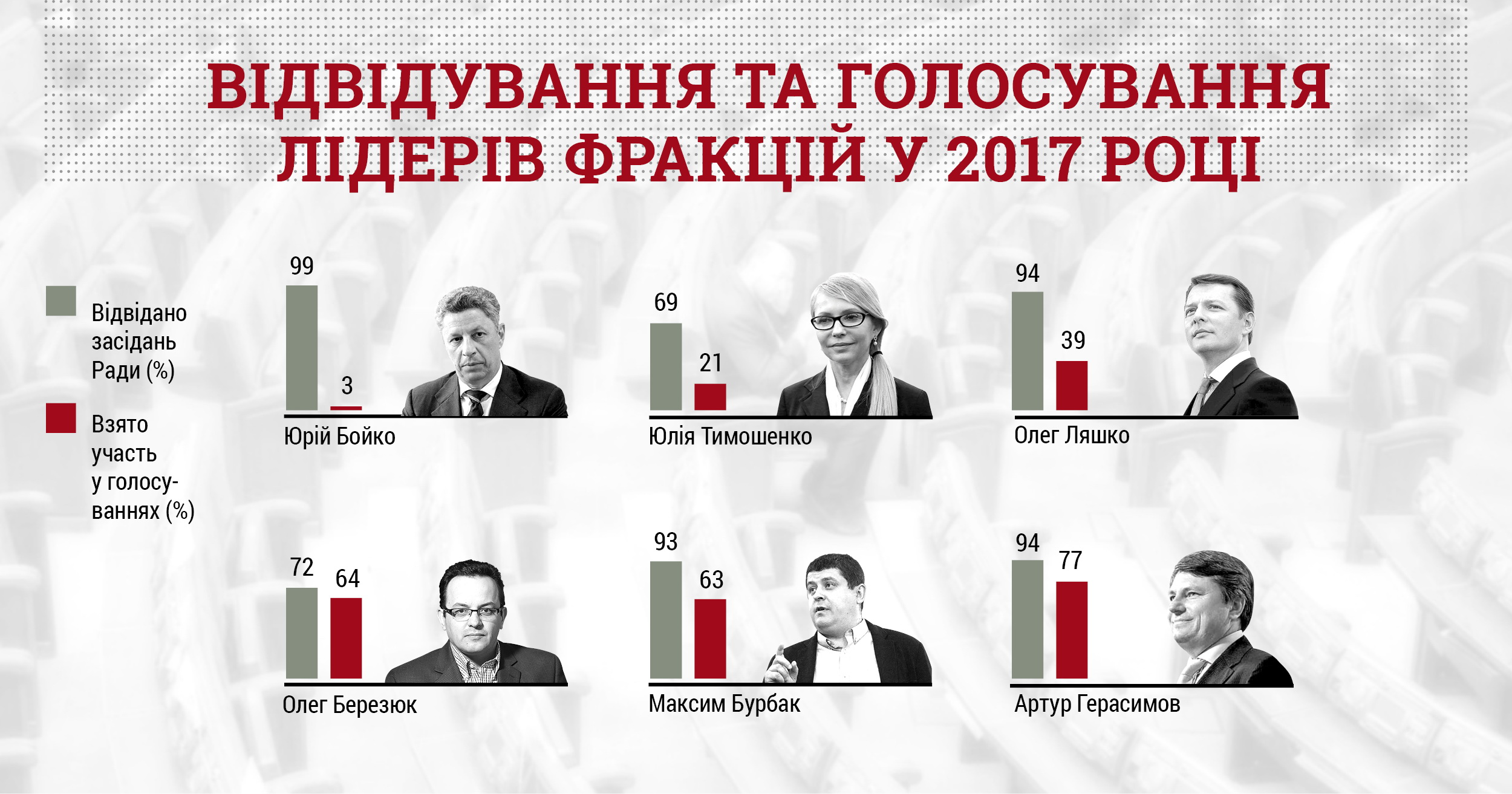 При этом политики, как правило, присутствовали на пленарных заседаниях ВР, однако не голосовали. По данным письменной регистрации в 2017 году Юрий Бойко посетил 99% заседаний парламента, Юлия Тимошенко – 69%, Олег Ляшко – 94%, Максим Бурбак – 93%, Олег Березюк – 72%, Артур Герасимов – 94%.