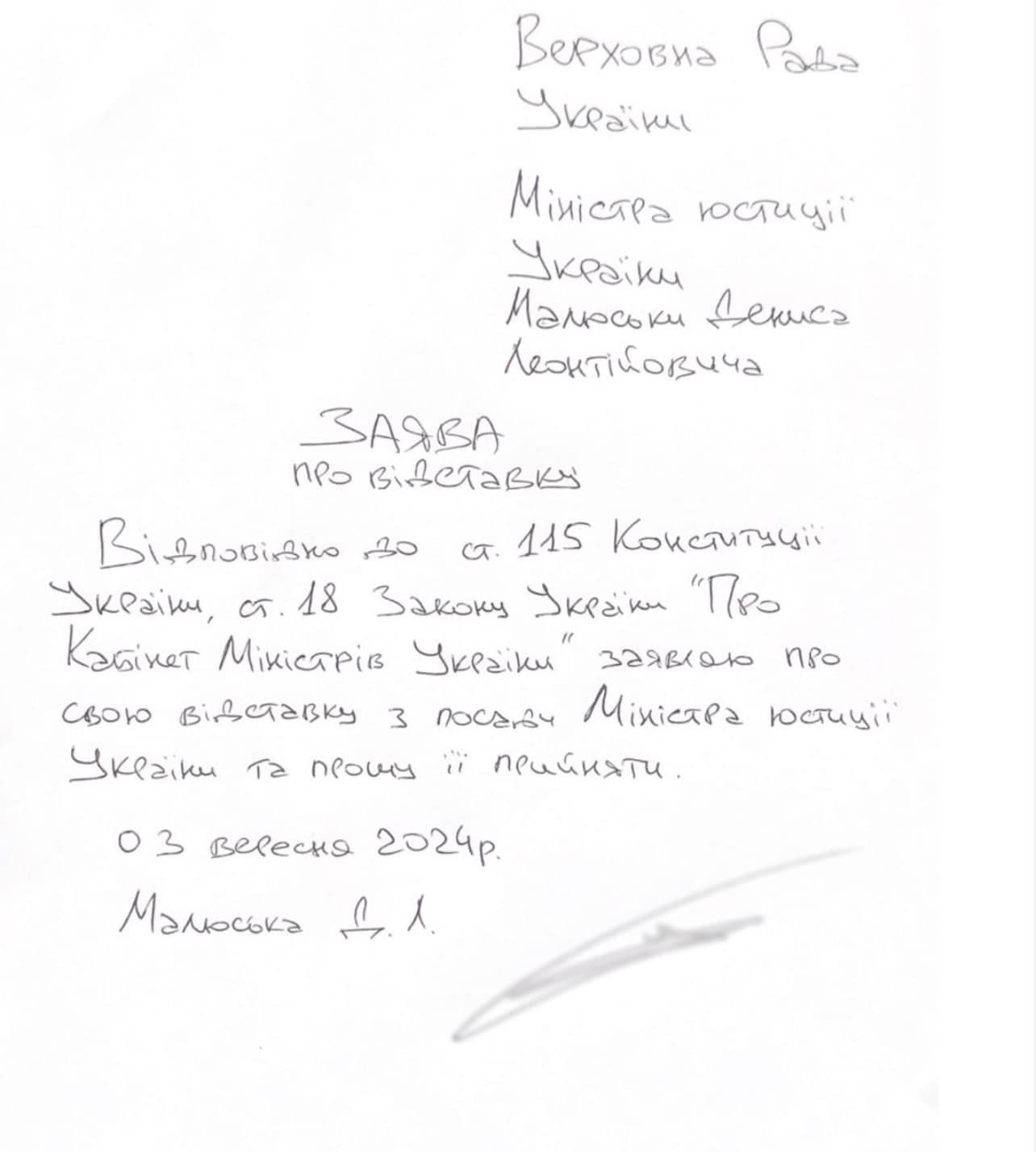 Еще в июле стало известно, что министр юстиции Денис Малюська давно подписал заявление об отставке без указания даты. Не увольняли его из-за отсутствия замены, но не исключалось, что полномочия руководителя министерства юстиции могут возложить на вице-премьер-министр по вопросам европейской и евроатлантической интеграции Украины Ольгу Стефанишину.