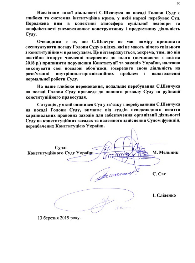 Деятельность С.Шевчука на посту Председателя Суда убедительно показала, что избрание его на эту должность было роковой ошибкой. На сегодня становится очевидным, что дальнейшее пребывание Сек.Шевчука на этом посту приведет к развалу Суда и разрушению конституционного правосудия в целом..."