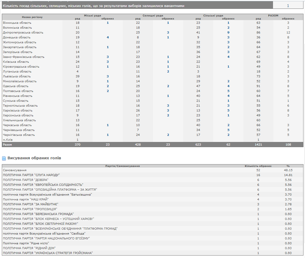 Избранными признаны 23 городских, 23 поселковых и 62 сельских головы. 52 из них беспартийные самовыдвиженцы, 16 баллотировались как кандидаты от «Слуги народа». По шесть победителей у «Европейской Солидарности», партии «Доверие» и пророссийской «Оппозиционной платформы – За жизнь». У «Батькивщины» и «Нашего края» пока что по четыре победителя выборов, у «За будущее» - три, у «Пропозиции» - два.