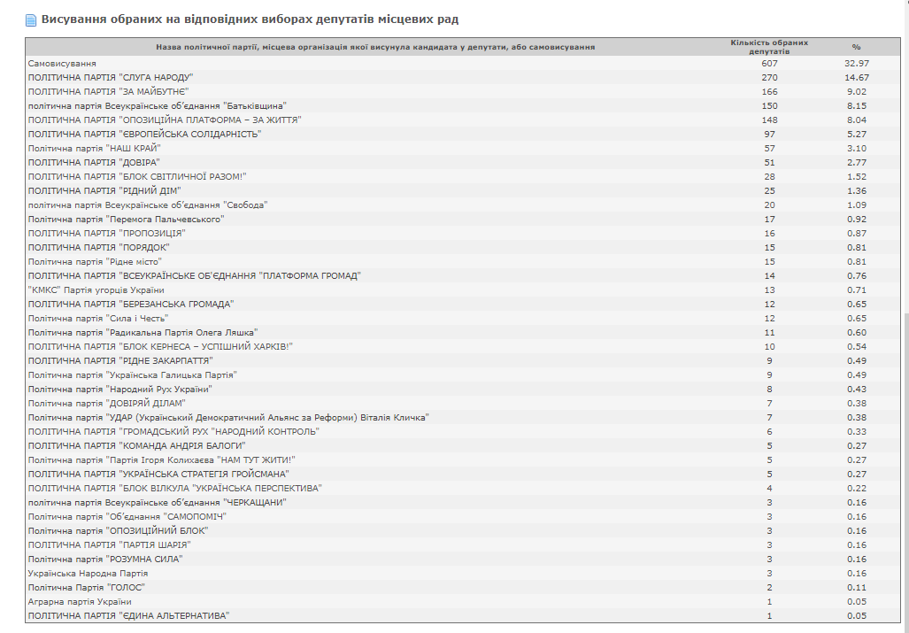 Избранными признаны 272 городских, 395 поселковых и 1174 сельских депутата. Среди них 607 самовыдвиженцев, 270 кандидатов от «Слуги народа», 166 представителей партии «За будущее», 150 «Батькивщины», 148 ОПЗЖ и 97 «Европейской Солидарности».