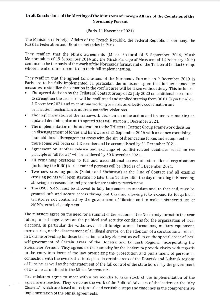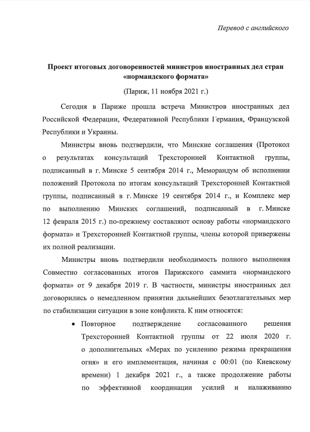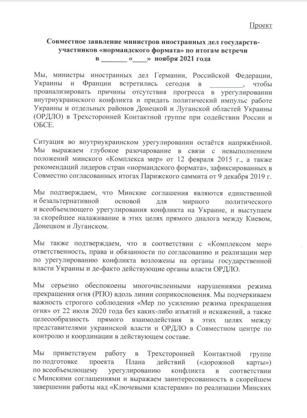 Министерство иностранных дел России опубликовало переписку Сергея Лаврова с главами дипломатий Германии и Франции Хайко Маасом и Жан-Ивом Ле Дрианом. Среди скан-копий писем есть и проект итогового соглашения министров стран нормандского формата, Москва настаивает на его согласовании до проведения встречи.