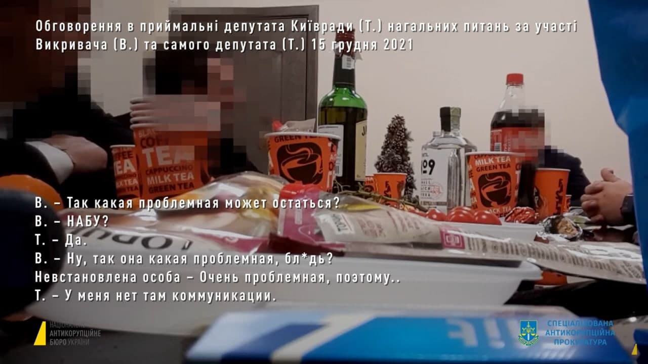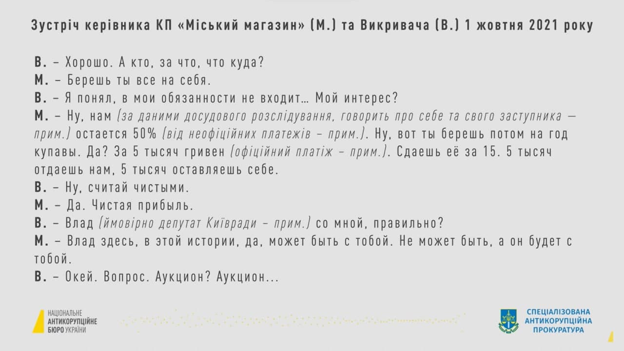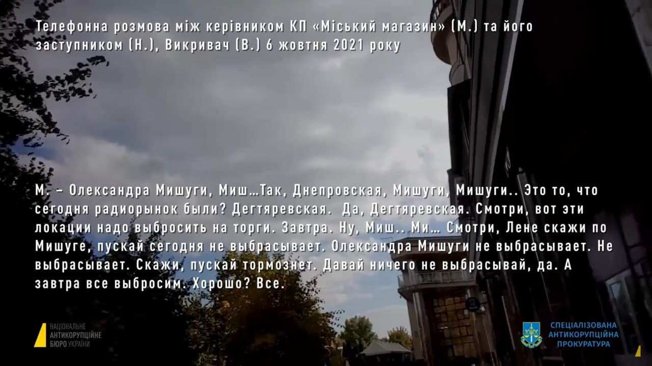 Во время одного из разговоров бизнесмен выбрал для киосков локации на Днепровской Набережной, улицах Дегтяревской и Александра Мишуги. После этого разговора руководитель КП позвонил своему заместителю и попросил «выбросить эти локации на торги», а также дал указания «придержать» локацию на улице Александра Мишуги.
