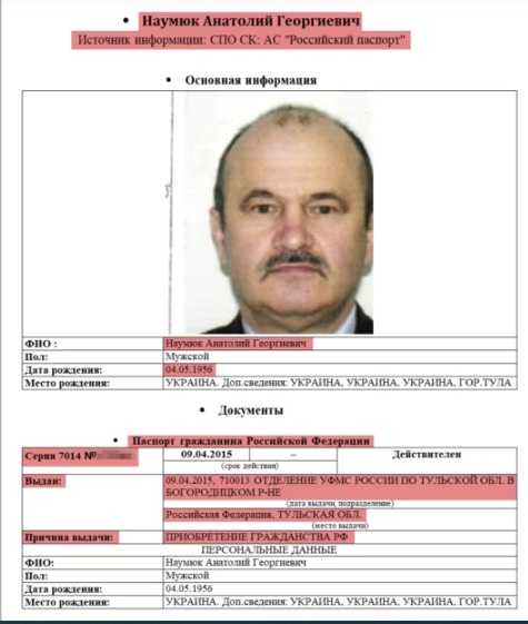 Согласно выписке из российского реестра стало известно, что паспорт гражданина РФ Анатолия Наумюка был оформлен в 2015 году в городе Тула. Согласно документу, он подал заявление на получение гражданства, указав основанием выдачи паспорта – «приобретение гражданства Российской Федерации». Также он имеет индивидуальный налоговый номер налогоплательщика в России.