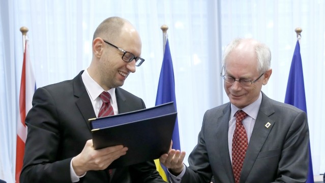 От Украины Соглашение подписал премьер-министр Арсений Яценюк, от ЕС – президенты Совета ЕС Херман Ван Ромпей и Европейской комиссии Жозе Мануэль Баррозу, а также главы государств и правительств стран ЕС.