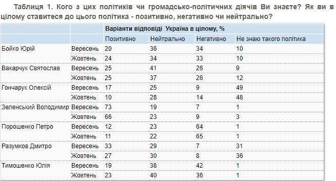 Вместе с тем социологи отмечают низкий уровень знания глав парламента и правительства среди опрошенных украинцев: 48% не знают, кто такой Алексей Гончарук, 36% затруднились ответить, кто такой Дмитрий Разумков (уровень знания главы ВР колеблется: в сентябре его не знали 31% опрошенных).