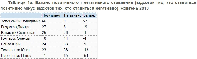 Что касается баланса положительного и отрицательного отношения, тут в октябре лидируют Владимир Зеленский (+57%), Дмитрий Разумков (+19%) и лидер партии "Голос" Святослав Вакарчук (-1%).