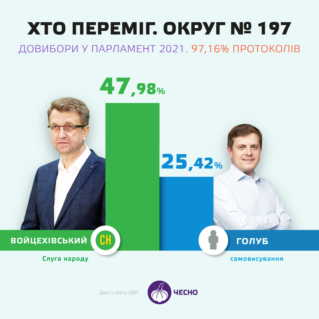 По итогам обработки 97,16% протоколов на промежуточных выборах в Черкасской области (197 округ) в Верховную Раду побеждает Золотоношский городской голова Сергей Войцеховский, которого выдвинула партия "Слуга народа". За него отдали голоса около 47% избирателей. Об этом информирует движение "Честно".