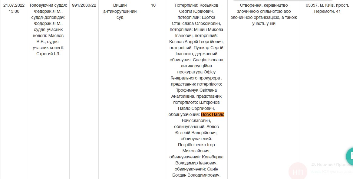 По делу по обвинению председателя Окружного административного суда Киева Павла Вовка, судей ОАСК и других лиц в создании преступной организации с целью злоупотреблений определена коллегия судей Высшего антикоррупционного суда, которая будет рассматривать уголовное производство, а также назначена дата подготовительного заседания. Соответствующие данные автоматизированного дел обнародованы на сайте Судебной власти Украины.