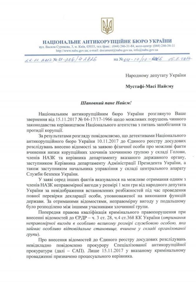 В уголовном производстве, которое открыло Национальное антикоррупционное бюро Украины (НАБУ) против сотрудников Национального агентства по вопросам предотвращения коррупции (НАПК), содержится информация о взятке в 1 млн гривень, которую дал члену агентства народный депутат. Об этом сообщает в Facebook депутат от БПП Мустафа Найем со ссылкой на ответ НАБУ на его обращение.