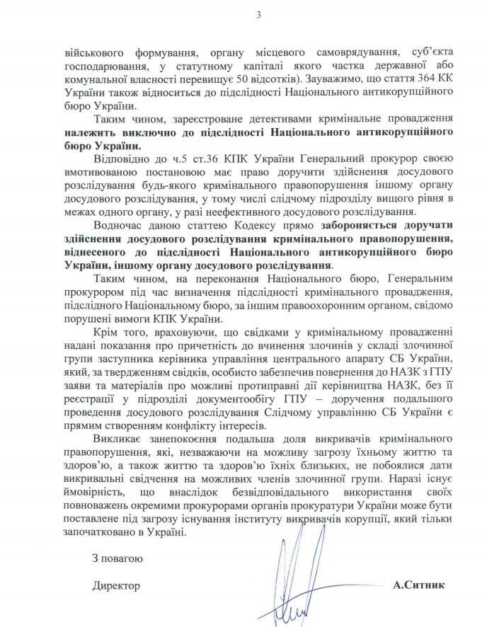 На основании полученных материалов НАБУ начало расследование по факту получения должностными лицами НАЗК неправомерной выгоды в особо крупных размерах, сопряженное с вымогательством. Предварительная правовая квалификация - 4 ч. ст. 368 (получение взятки) Уголовного кодекса Украины.