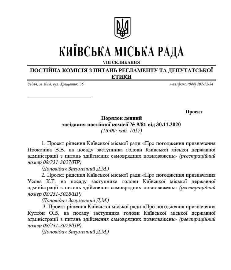 Согласно повестке дня Постоянной комиссии по вопросам регламента и депутатской этики, на заседании, которое запланировано на 16:00, рассмотрят проекты решения "О согласовании назначения Прокопива В.В. на должность заместителя главы Киевской городской государственной администрации по вопросам осуществления самоуправленческих полномочий".