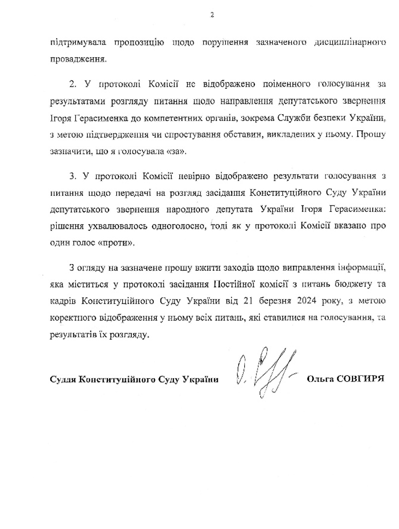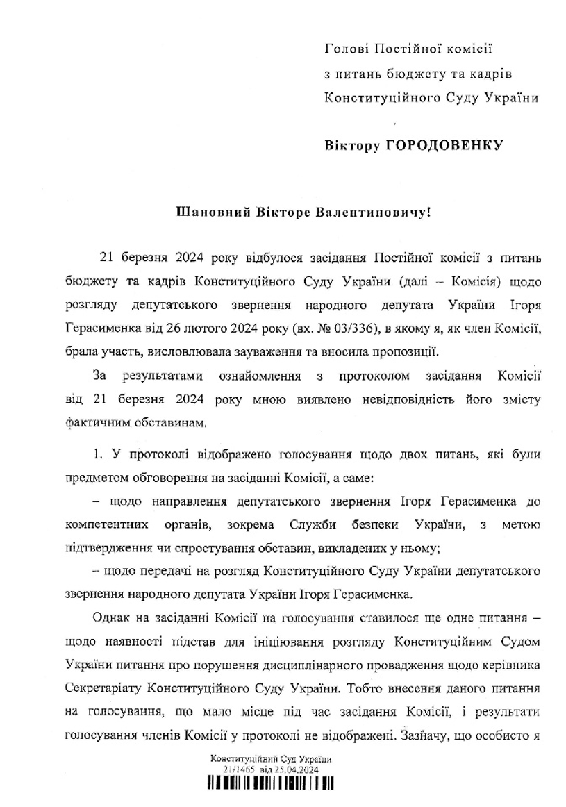 На такую сделку указала судья КС Ольга Совгиря, отметив, что в протоколе заседания Комиссии не отражены, во-первых, результаты поименного голосования рассмотрения вопроса о направлении депутатского обращения Герасименко в компетентные органы (в частности, СБУ), во-вторых, то, что на голосование ставился еще один вопрос – о наличии оснований для инициирования рассмотрения КС вопроса о нарушении дисциплинарного производства в отношении руководителя секретариата Бесчастного.