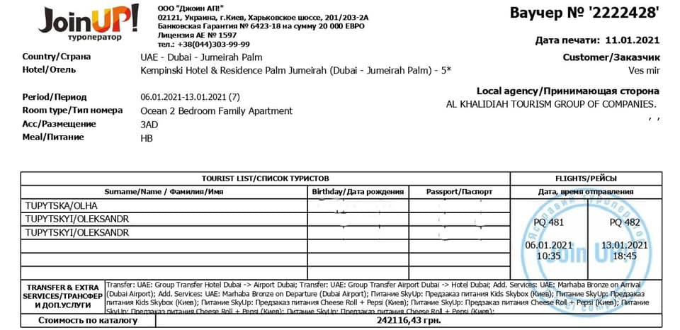 «Стоимость пакета услуг, предоставляемого туроператором на трех человек, составляет 242 116,43 грн. В стоимость тура входит авиаперелет в обе стороны, проживание в двухкомнатном номере отеля, двухразовое питание, трансфер, страховка и стоимость туристического обслуживания», - говорится в сообщении.