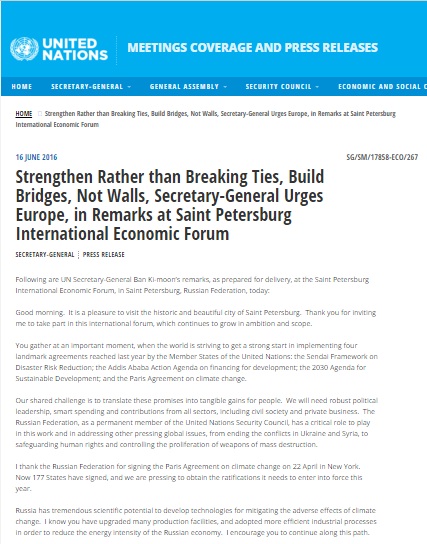 Следует отметить, что в итоговом варианте выступления Пан Ги Муна слов о роли РФ в разрешении конфликтов в Сирии и Украине не было. Данная ремарка присутствовала в более раннем варианте речи, подготовленном и обнародованном пресс-службой организации 16 июня. В ООН данную ситуацию не комментируют.