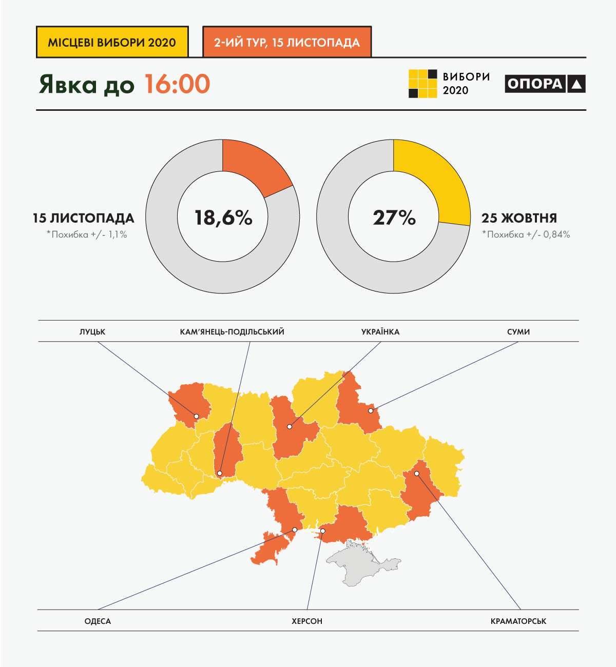 Явка избирателей в семи городах Украины, где 15 ноября проходит второй тур выборов мэра, в полтора раза ниже, чем в первом туре. По состоянию на 16:00 на участки пришли 18,6% избирателей (погрешность – 1,1%), 25 октября к этому же часу явка составляла 27%, сообщает «ОПОРА».