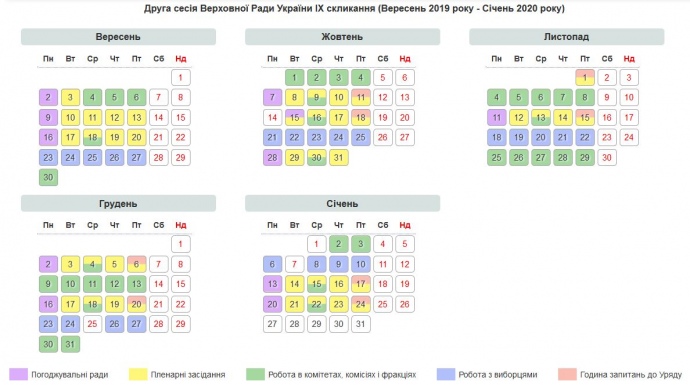 Верховная Рада Украины IX созыва обнародовала свой календарный план работ во время второй сессии, которая продлится с сентября 2019 года по январь 2020 года. Данные доступны на сайте Верховной Рады Украины.