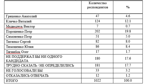 Исследование проводилось с 28-го февраля по 3 марта 2014 года. Респондентам предлагалось ответить на следующий вопрос: если бы выборы президента Украины проходили 25 мая, то за кого бы из претендентов вы проголосовали.