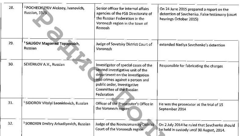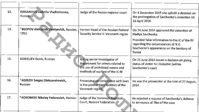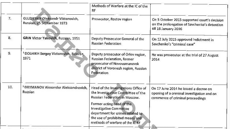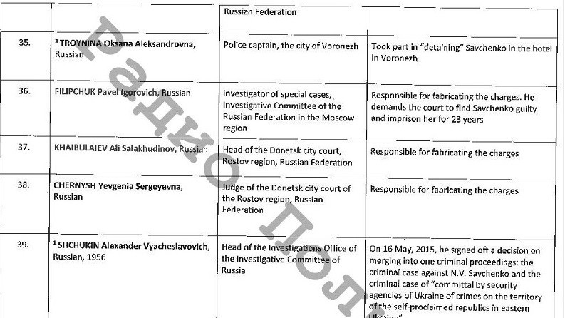 В перечень под названием "Предложение список лиц, ответственных за незаконное удержание Надежды Савченко", украинская власть внесла главу ФСБ РФ Александра Бортникова, председателя Следственного комитета РФ Александра Бастрыкина, руководителя Главного следственного управления СК РФ Александра Щукина, российских судей, прокуроров и следователей.