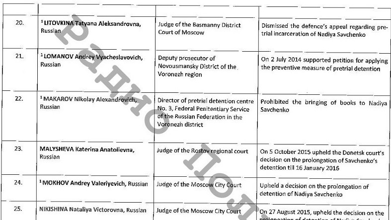 К санкционному "списку Савченко" добавлен перечень из 11 украинских граждан, которые незаконно находятся на территории РФ. Среди них названы Надежда Савченко, Олег Сенцов, Александр Кольченко, Александр Костенко, Николай Клых, Станислав Капрюк и другие политзаключенные.