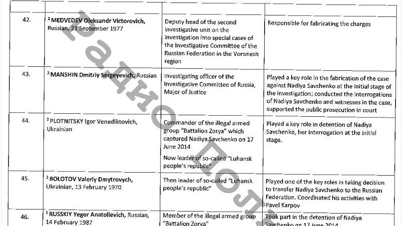 Список лиц, причастных к делу украинской летчицы Надежды Савченко, насчитывает 46 фамилий, сообщает Радио Польша со ссылкой на соответствующий документ.