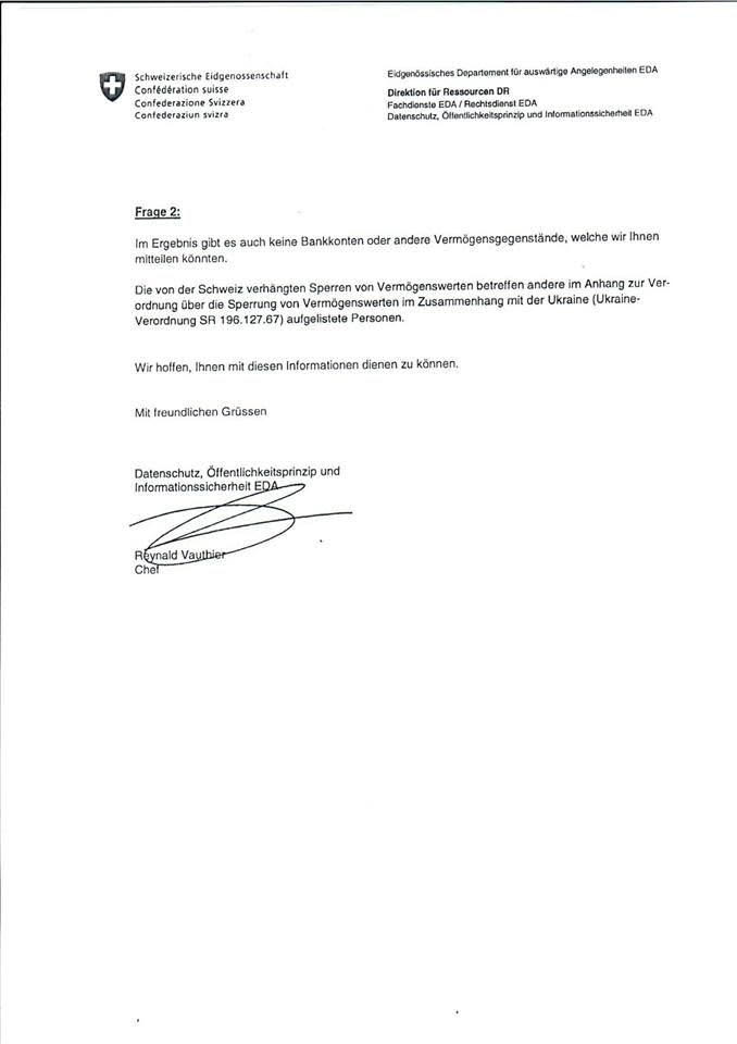 Швейцарский федеральный совет до сих пор четко не указывает, кому принадлежат "70 миллионов швейцарских франков", упомянутые в их сообщении, но при этом официально признает, что они не принадлежат Президенту Януковичу".