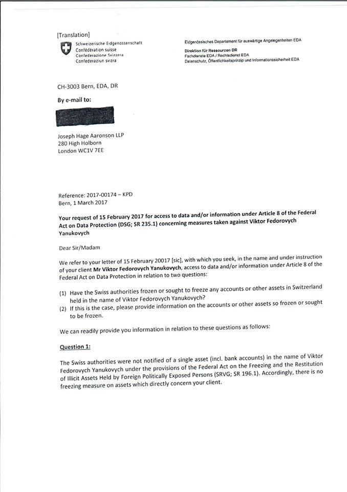 "(1) в Швейцарии нет банковских счетов или других активов на имя Президента Януковича, которые они заморозили;