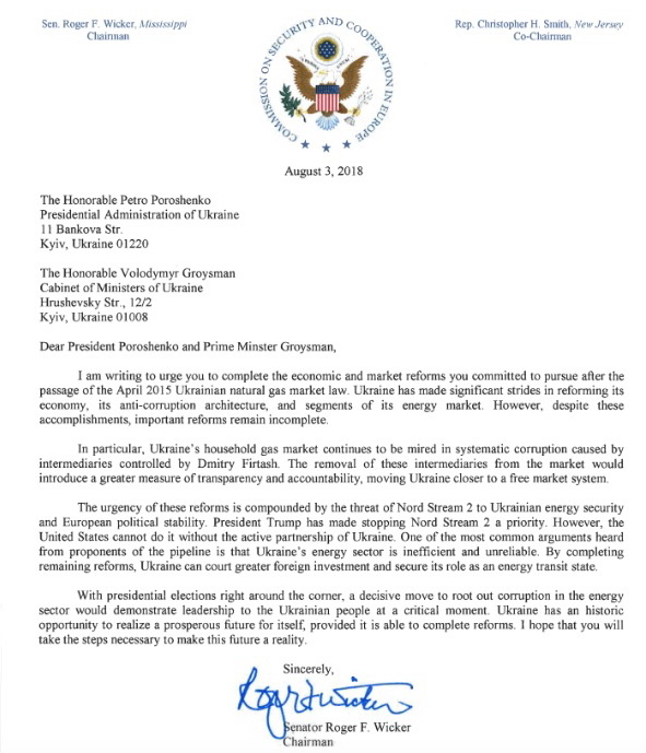 Представители государственных органов США призвали официальный Киев продолжить реформирование рынка газа и избавиться от системной коррупции, которую создают компании-посредники, аффилированные с Дмитрием Фирташем. Об этом говорится в письме Комиссии по безопасности и сотрудничеству в Европе, фотокопию которого обнародовала "Экономическая правда" в четверг, 30 августа. Письмо, подписанное сенатором Роджером Ф. Викером, адресовано президенту Петру Порошенко и премьер-министру Владимиру Гройсману.