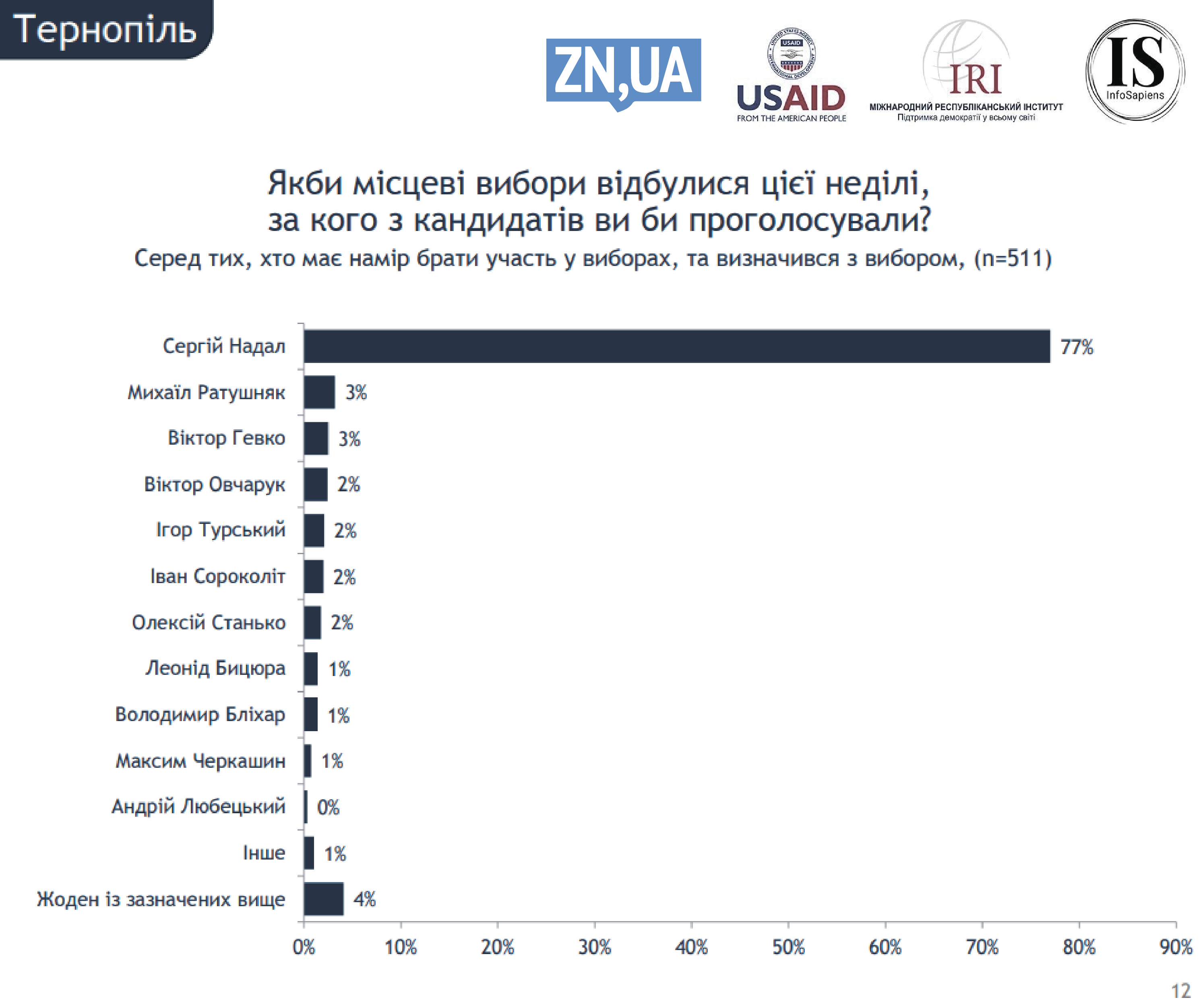 Отмечается, что конкурентов Надала поддерживает Петр Ландяк, многолетний оппонент мэра Тернополя. Было время, когда Ландяк даже был заместителем Надала, но недолго. И хотя в этом году Ландяк не стал баллотироваться на пост градоначальника, без вливаний владельца трех супермаркетов и строительного бизнеса кампания не обошлась. Однако: все конкуренты действующего мэра дружно балансируют на уровне 2–3%.