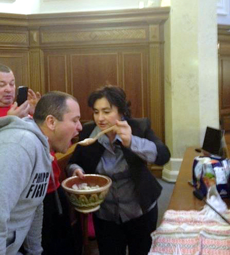 В свою очередь другой депутат от "УДАРа" Ирина Геращенко призвала представителей "Свободы" и "Батьківщини" присоединиться к дежурству в сессионном зале парламента и на выходных. На своей странице в Facebook она выложила фото депутатов от "УДАРа" в сессионном зале в субботу и сообщила, что ее коллега, писательница Мария Матиос принесла присутствующим в Раде вареники и пирожки.