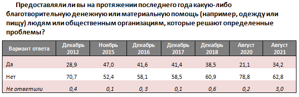 Около трети граждан говорят, что предоставляют благотворительную денежную или материальную помощь людям или общественным организациям, которые решают определенные общественные проблемы.
