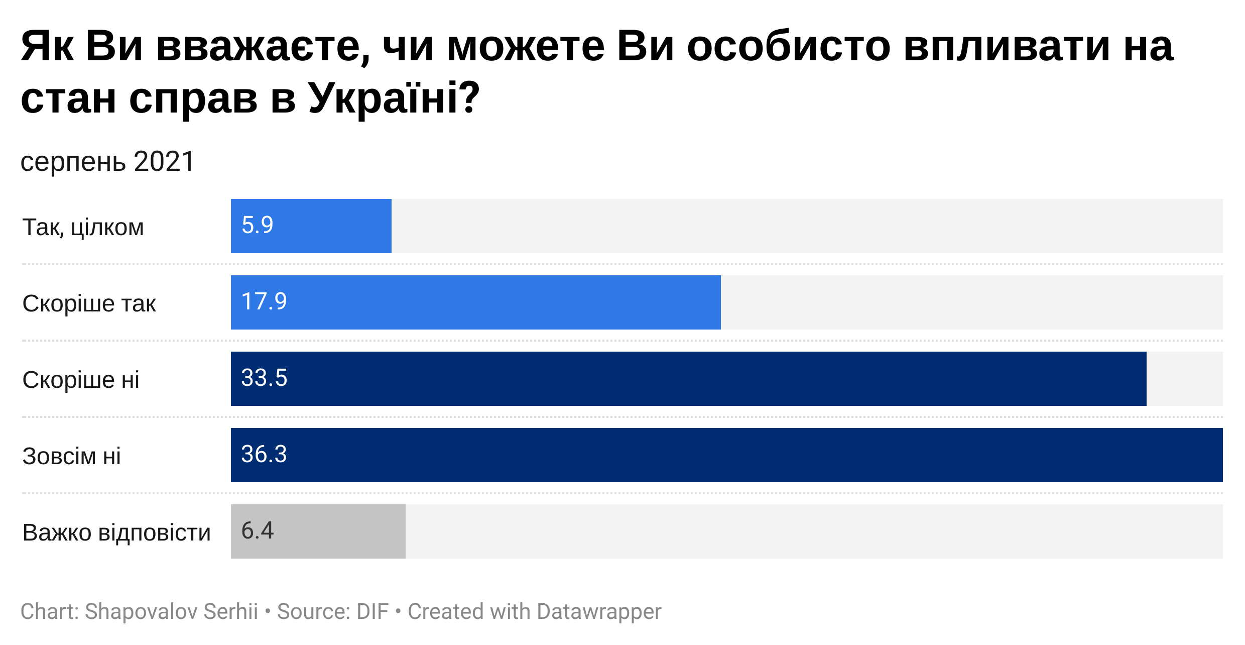 В Украине около 24% граждан верят в свою способность влиять на состояние дел в стране, но почти 70% считают, что лично они не могут повлиять на это.