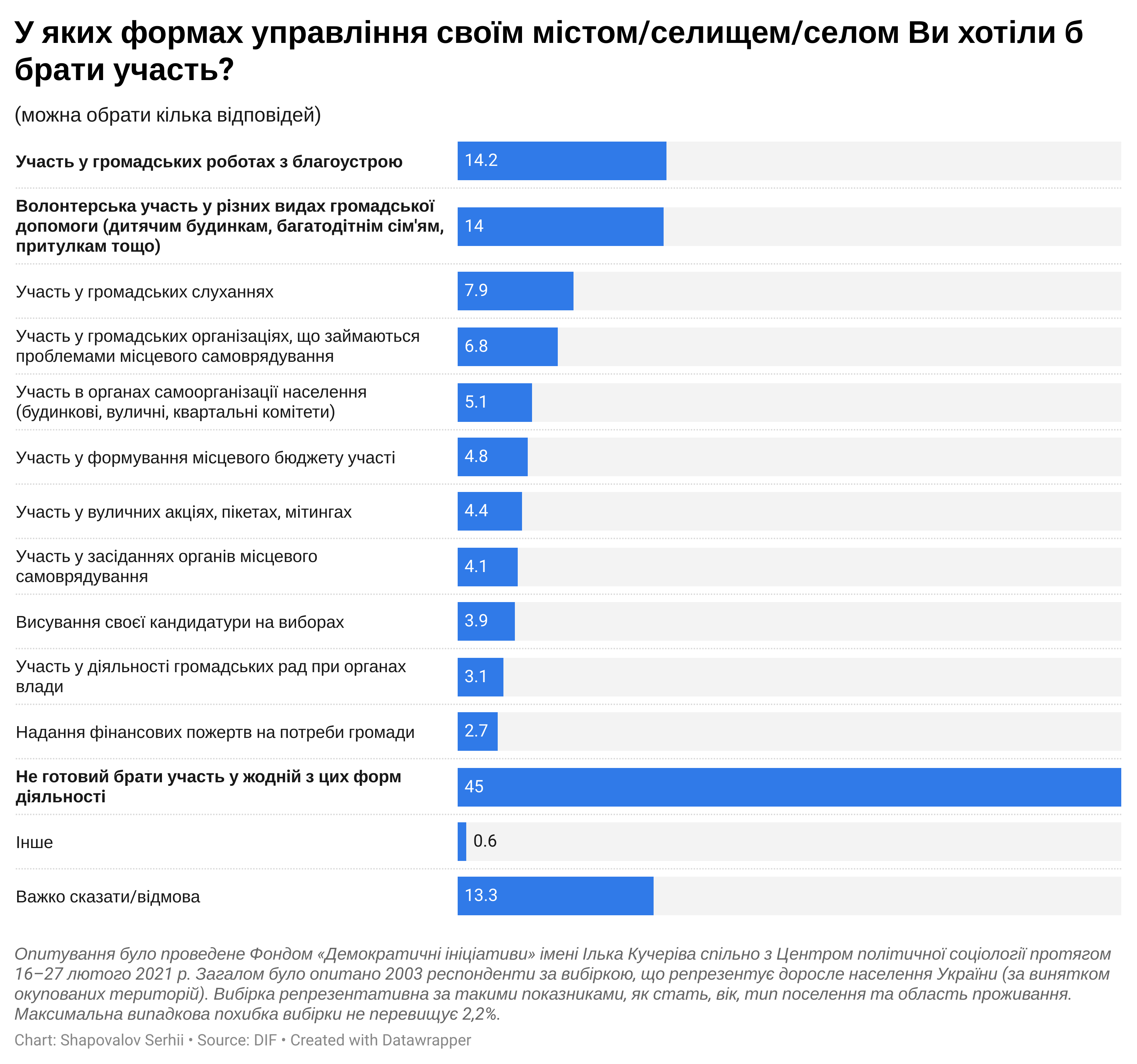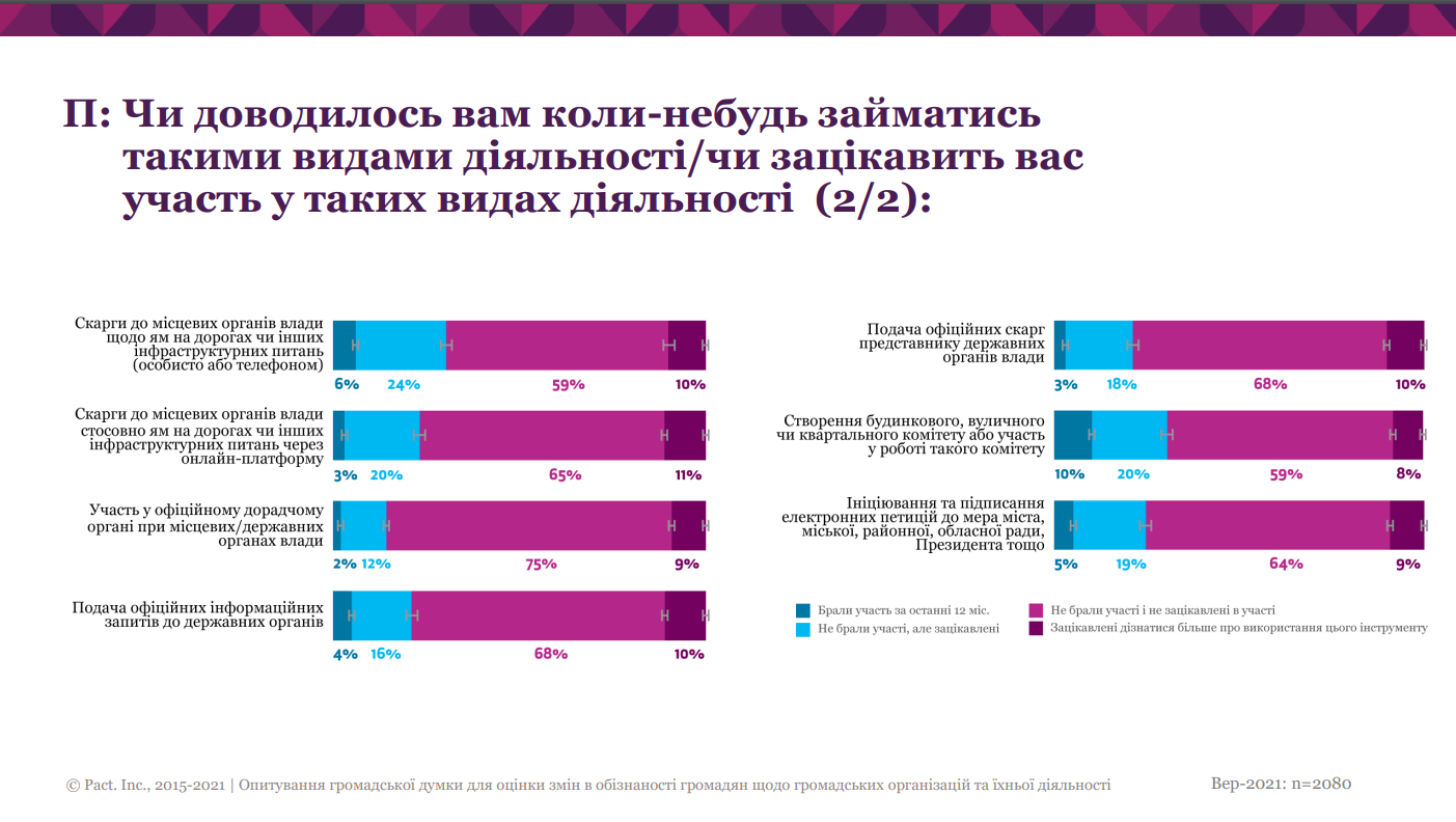 Согласно опросам, до 10% граждан Украины приобщаются к тем или иным формам общественно-политической активности. К действиям, направленным на то, чтобы влиять на принятие решений (хотя бы на местном уровне), готовы приобщаться еще меньше.