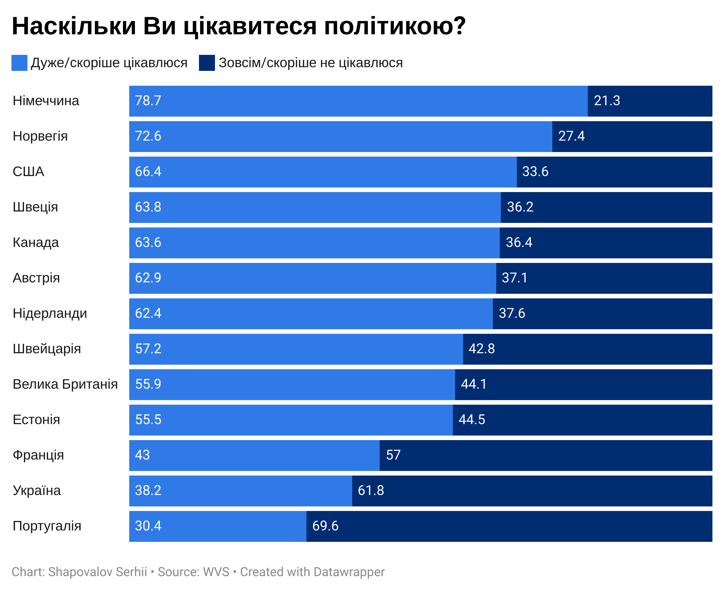 По уровню интереса граждан к политике Украина оказалась в конце списка среди сравниваемых стран. Но для гражданской политической культуры важно не только количество активно интересующихся политикой граждан. Важна потенциальная вовлеченность, то есть масса людей, которая может мобилизоваться для политического участия в случае необходимости, отмечает автор.