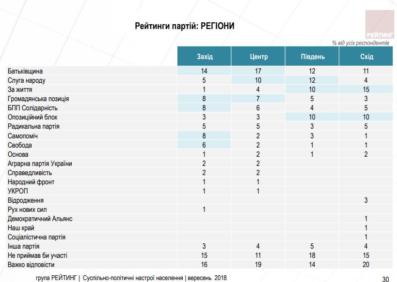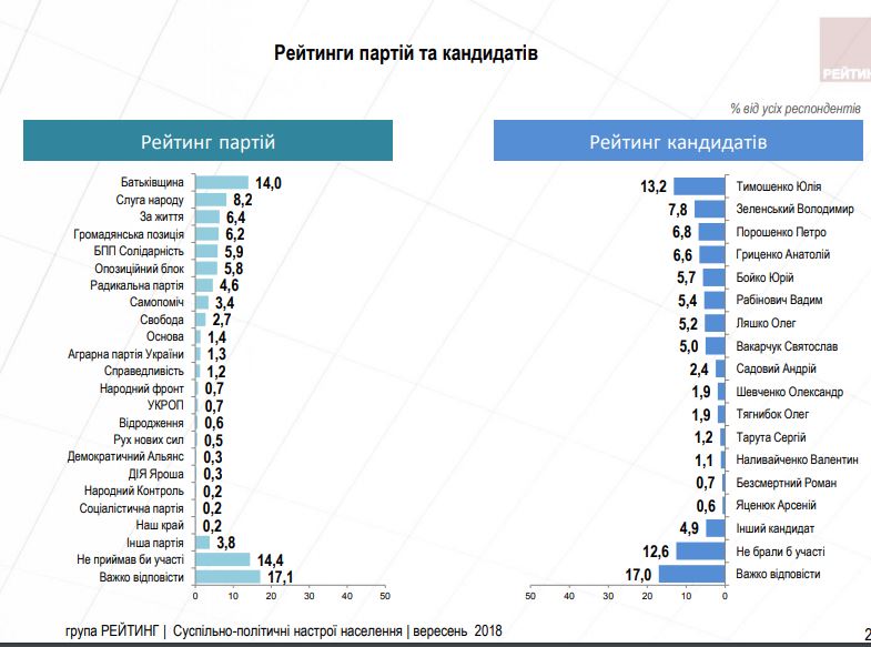В частности, на предстоящих выборах в парламент ВО "Батькивщина" готовы поддержать 14% опрошенных, 8,2% отдали бы свои голоса за партию "Слуга народа" шоумена Владимира Зеленского, 6,4% - за партию "За життя" Вадима Рабиновича, 6,2% - "Гражданскую позицию" Анатолия Гриценко, 5,9% - за Блок Петра Порошенко "Солидарность", 5,8% - за "Оппозиционный блок". Также за Радикальную партию Олега Ляшко проголосовали бы 4,6%, что также дает ей шансы на прохождение в парламент нового созыва.