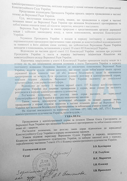 В постановлении суда, датированном 21 января, указано, что суд принял решение закрыть производство по иску юриста. Основанием для такого решения ВАСУ назвал то, что вопрос импичмента президента должен инициироваться большинством конституционного состава Верховной Рады. Суд также отметил, что рассмотрение таких дел относится к юрисдикции Конституционного суда Украины.