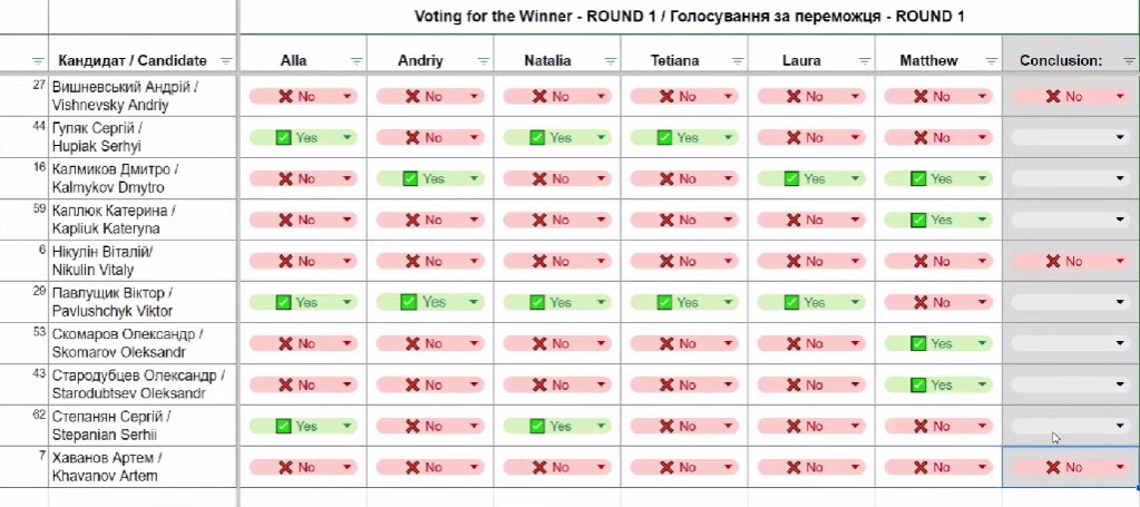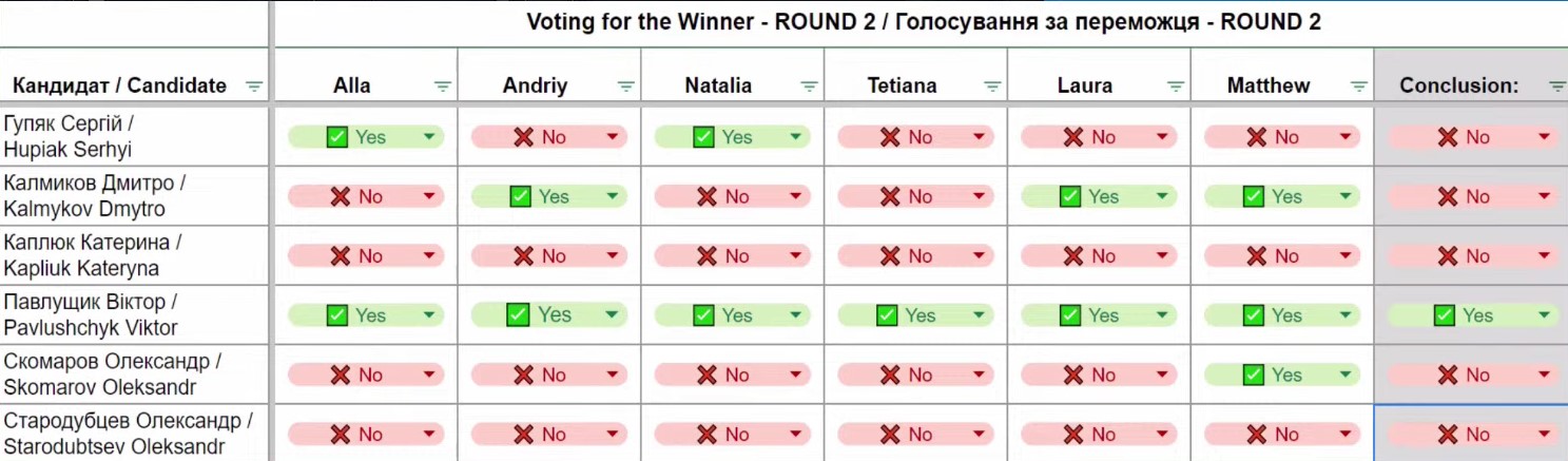 Комиссия во второй тур допустила кандидатов: Сергей Гупяк, Дмитрий Калмыков, Екатерина Каплюк, Виктор Павлущик, Александр Скомаров, Александр Стародубцев. Выбыли кандидаты, не получившие ни одного голоса от членов комиссии со стороны международных доноров.
