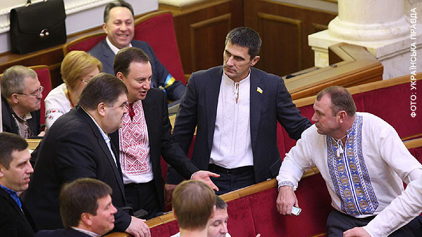 В частности, представители от оппозиции продолжили блокировать работу парламента. Все депутаты от "Батьківщини" пришли в Раду в вышиванках, "УДАРовцы" традиционно оделись в свои красные свитера с надписью "Голосуй особисто", они блокируют президиум.