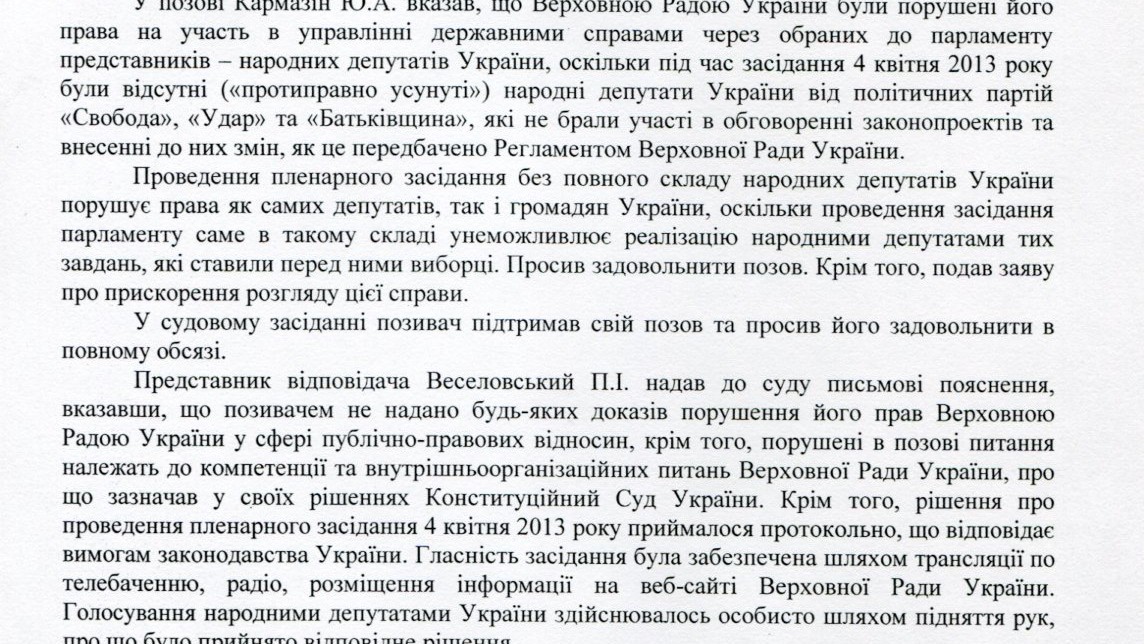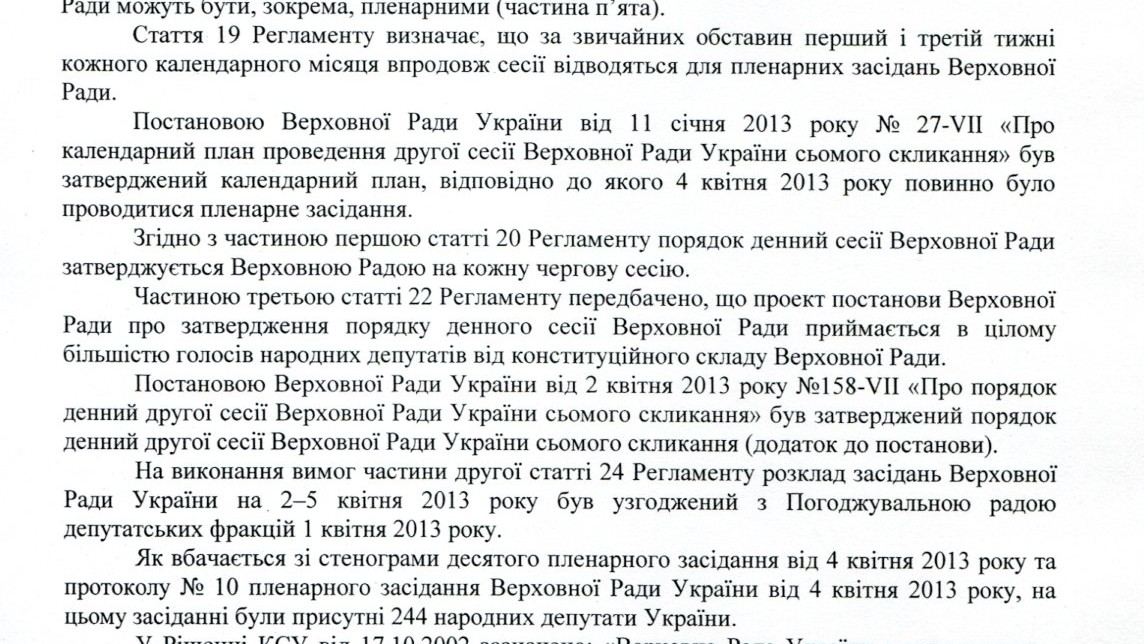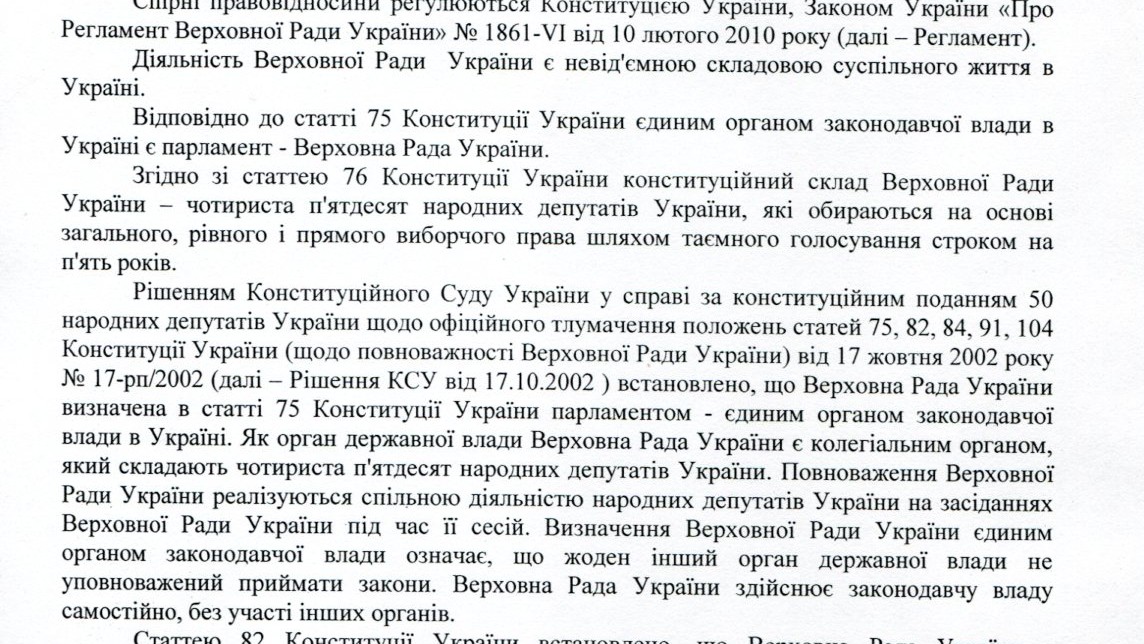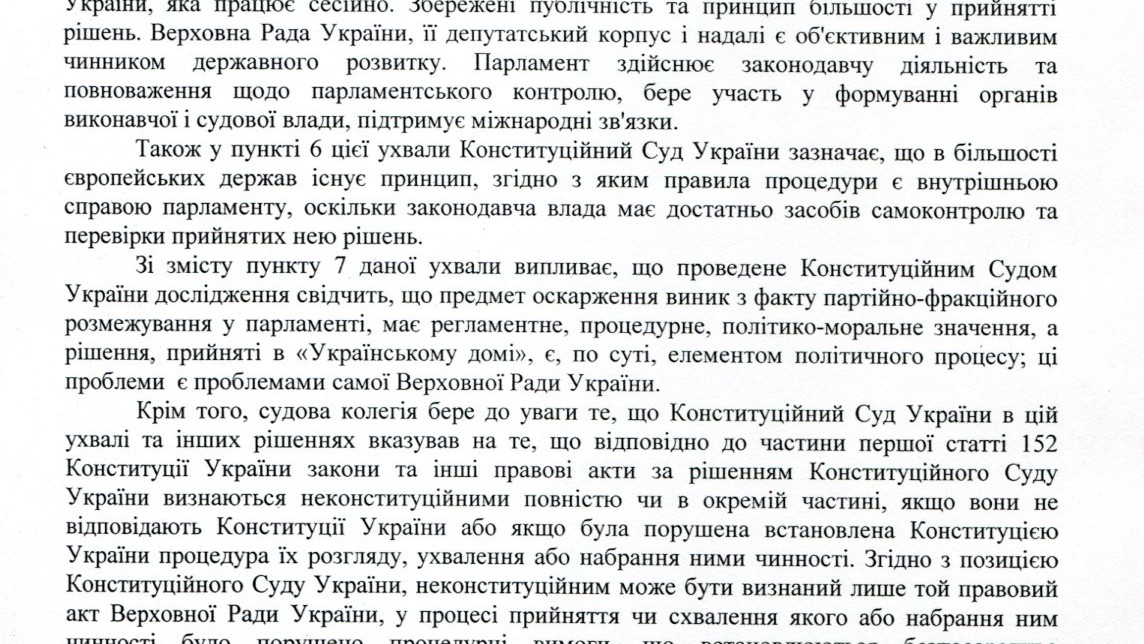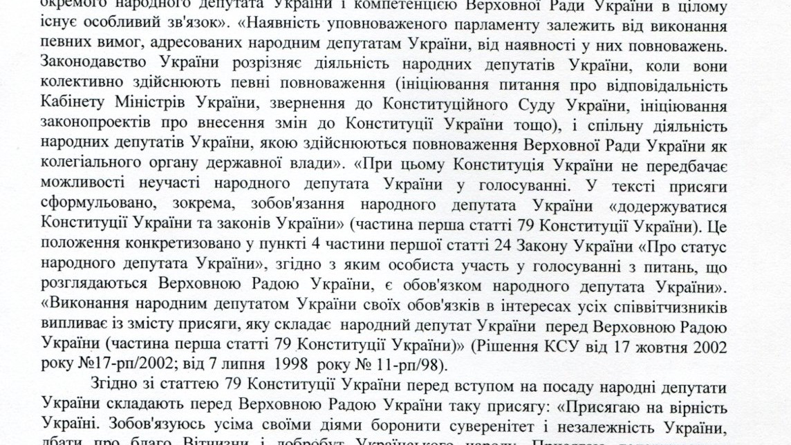 Как отметила пресс-служба, при принятии постановления суд, в частности, руководствовался решением Конституционного суда Украины от 17 октября 2002 года № 17-рп/2002 по делу по конституционному представлению 50 народных депутатов Украины относительно официального толкования положений статей 75, 82, 84, 91, 104 Конституции Украины (относительно полномочности Рады) и постановлением КСУ от 27 июня 2000 года № 2-уп/2000 "О прекращении конституционного производства по делу по конституционному представлению 57 и 69 народных депутатов Украины относительно" признания неконституционными актов, принятых на заседании части народных депутатов Украины в помещении "Украинского дома" 21 января и 1 февраля 2000 года", в которой Конституционный суд проводил исследования по подобным правоотношениям.