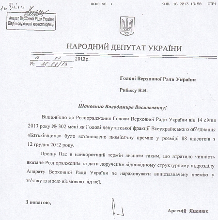 В то же время Арсений Яценюк предоставил копию зарегестрированного обращения о лишении его 88% надбавки.