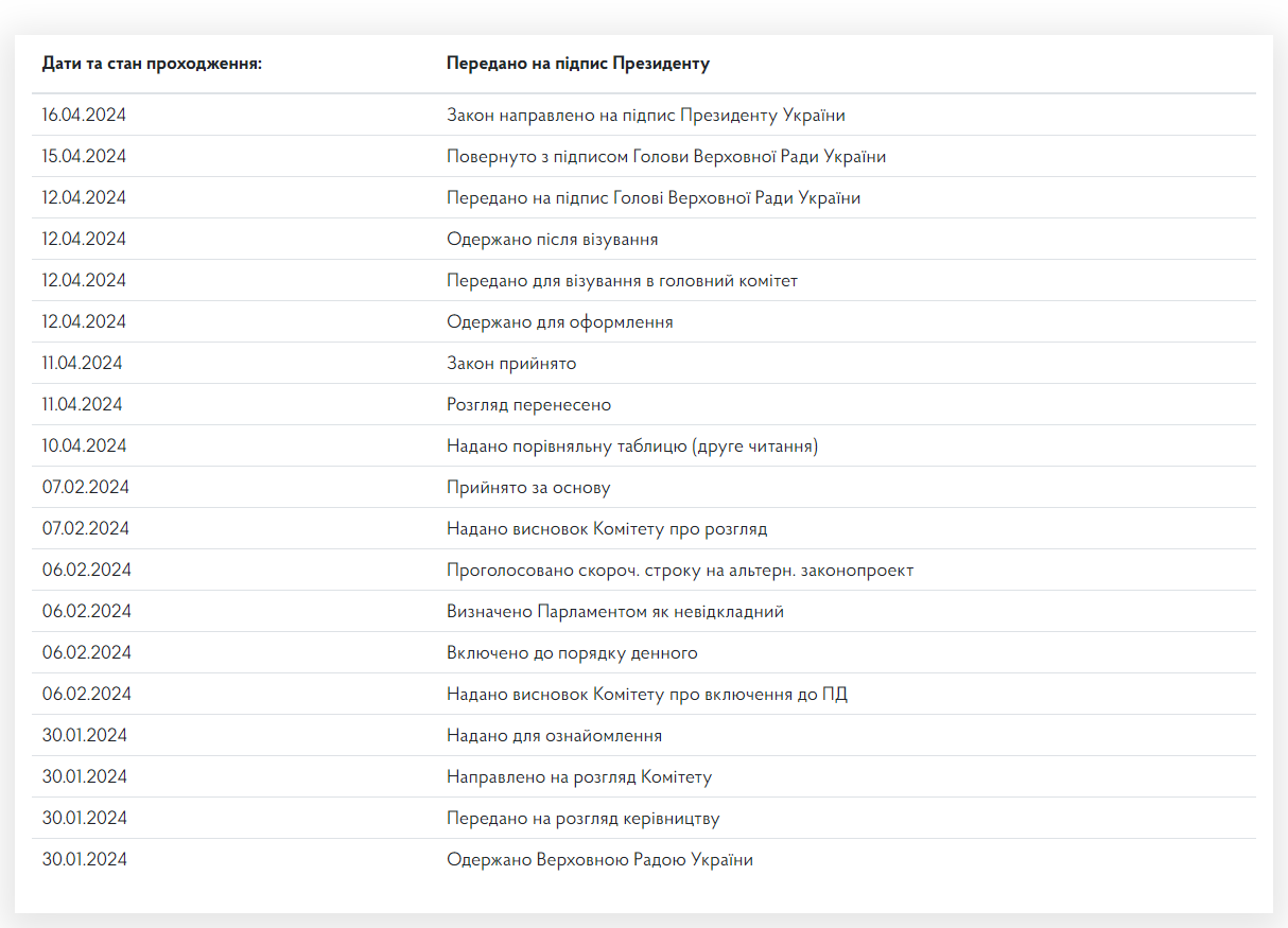 В частности, значится, что 16 апреля проект закона «О внесении изменений в некоторые законодательные акты Украины по отдельным вопросам прохождения военной службы, мобилизации и военного учета» направлен на подпись президенту Украины.