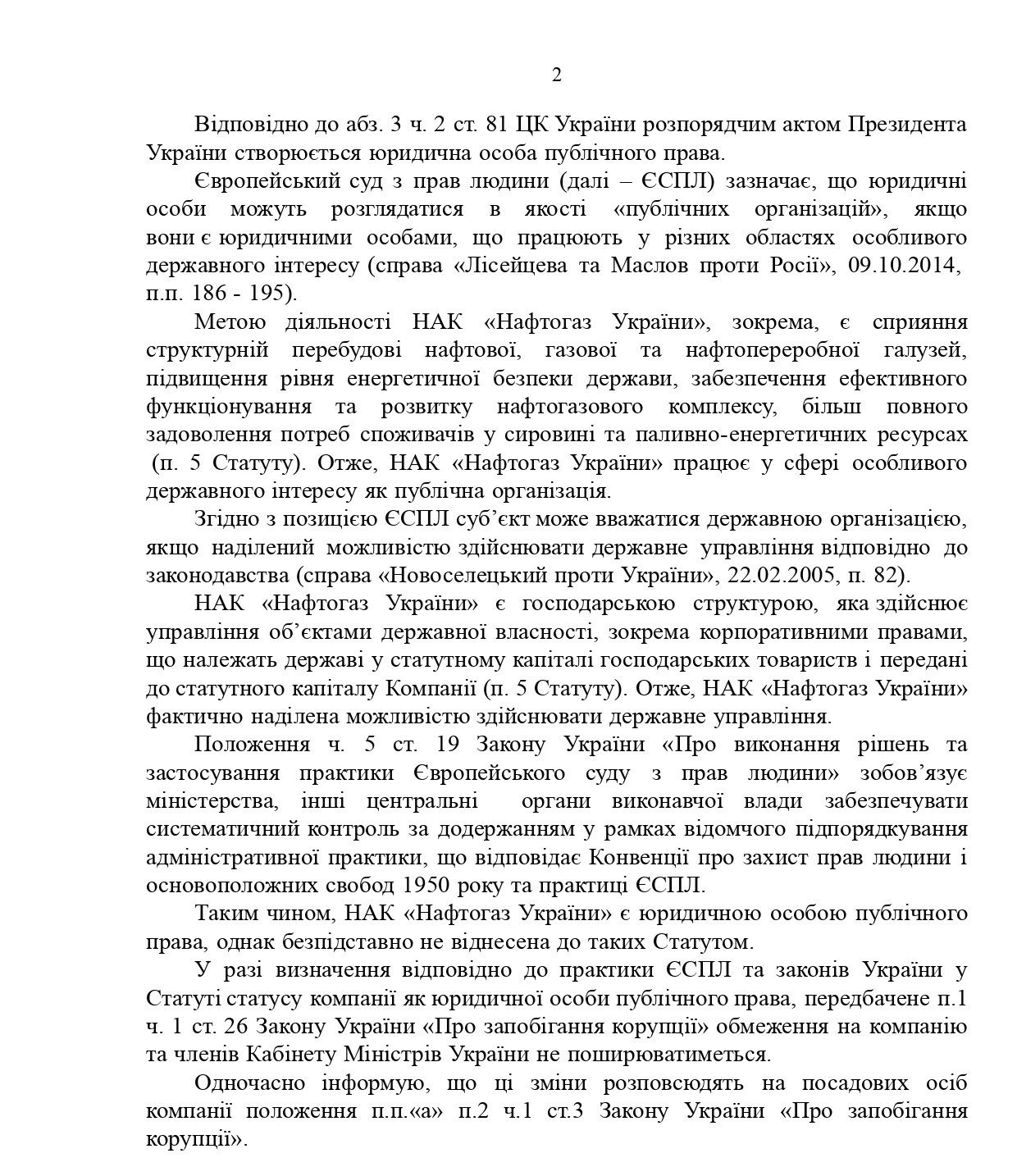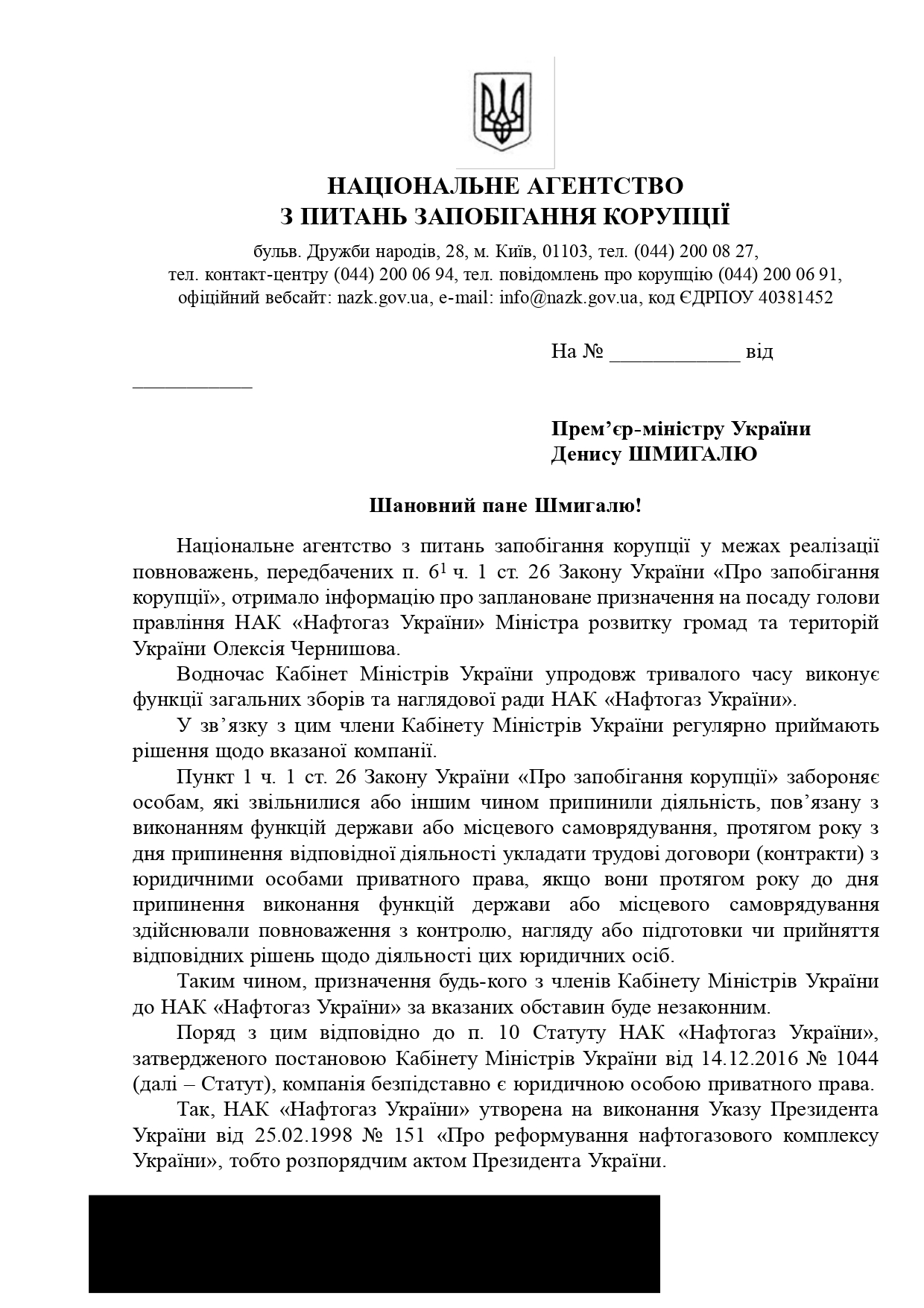 "Пункт 1 ч. 1 ст. 26 Закона Украины «О предотвращении коррупции» запрещает лицам, которые уволились или иным образом прекратили деятельность, связанную с выполнением функций государства или местного самоуправления, в течение года со дня прекращения соответствующей деятельности заключать трудовые договоры (контракты) с юридическими лицами частного права, если они в течение года до дня прекращения выполнения функций государства или местного самоуправления осуществляли полномочия по контролю, надзору, подготовке или принятию соответствующих решений относительно деятельности этих юридических лиц. Таким образом, назначение кого-либо из членов Кабинета Министров Украины в НАК «Нафтогаз Украины» при указанных обстоятельствах будет незаконным", – говорится в письме.