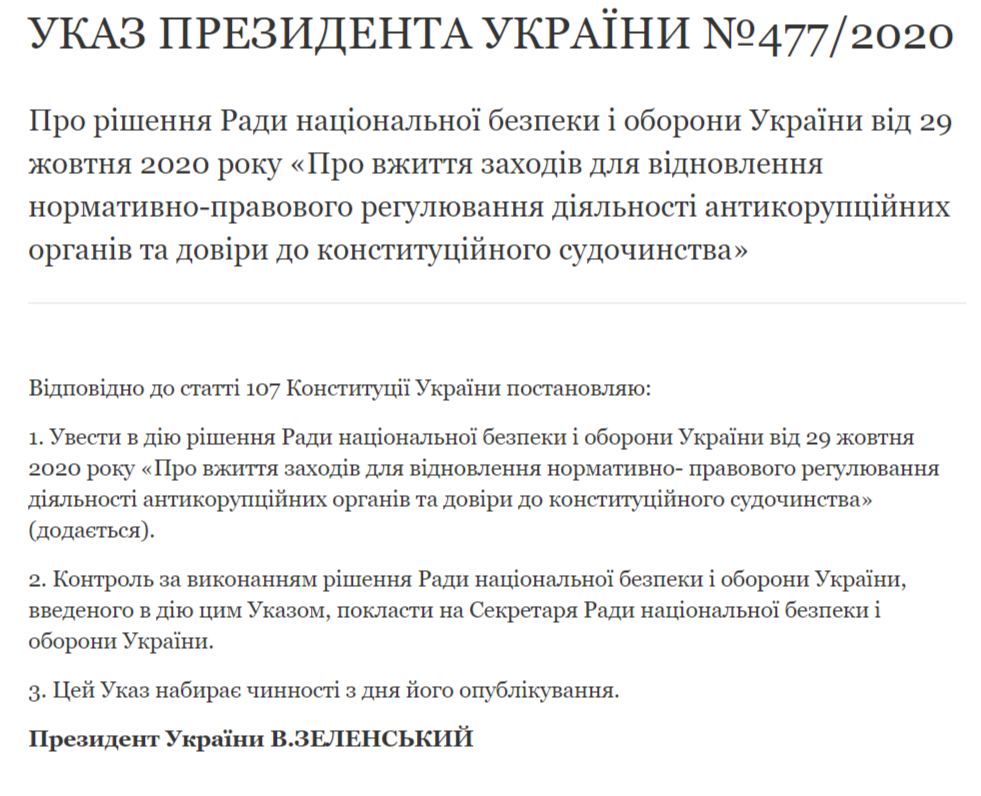 Президент Украины Владимир Зеленский подписал Указ № 477/220 "О решении Совета национальной безопасности и обороны Украины от 29 октября 2020 года "О принятии мер для восстановления нормативно-правового регулирования деятельности антикоррупционных органов и доверия к конституционного судопроизводства", которым ввел в действие решение, принятое на экстренном заседании СНБО.