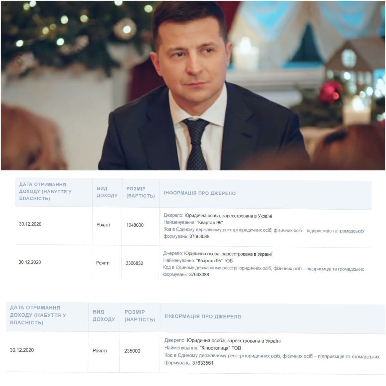 Так, 30 декабря компания "Квартал 95" перечислила Зеленскому роялти на сумму 4,355 млн гривен, в этот же день "Киностолица" перечислила президенту - 235 тыс. грн в качестве вознаграждения за использование авторских прав, патентов и других форм собственности.