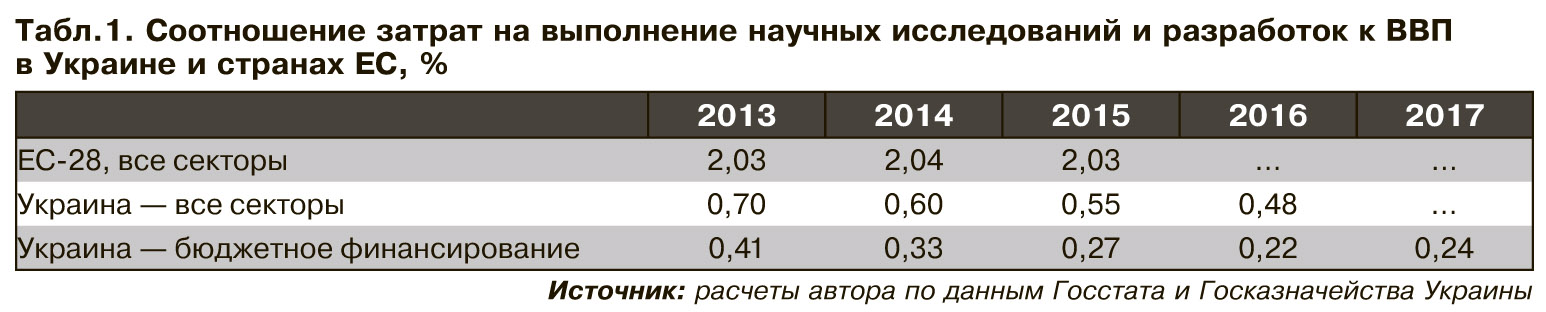 Для сравнения: в странах ЕС в 2014 г. бюджетное финансирование сферы исследований и разработок установилось на уровне 0,84% ВВП. С приведенными данными резко контрастирует обязательство государства обеспечивать бюджетное финансирование указанной сферы в Украине в размере не менее 1,7 % ВВП страны (статья 48 Закона "О научной и научно-технической деятельности").
