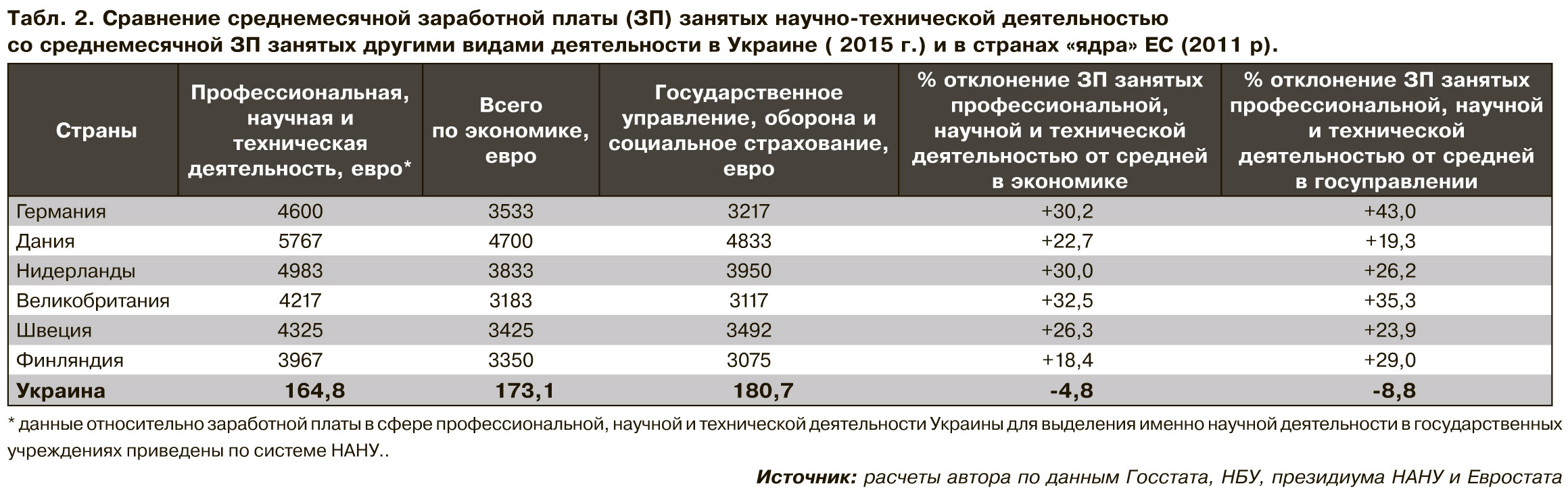 Что касается сравнений с международными данными, то приведенные нами свидетельствуют: только в Украине средняя заработная плата в учреждениях НАН была ниже как от средней по экономике (на 4,8%), так и от средней по государственному управлению, обороне и социальному страхованию (на 8,8%). В странах "ядра" ЕС, наоборот, заработная плата занятых профессиональной, научной и технической деятельностью превышала среднюю по экономике на 18,4–32,5%, а среднюю по сектору государственного управления - на 23,9–43%.