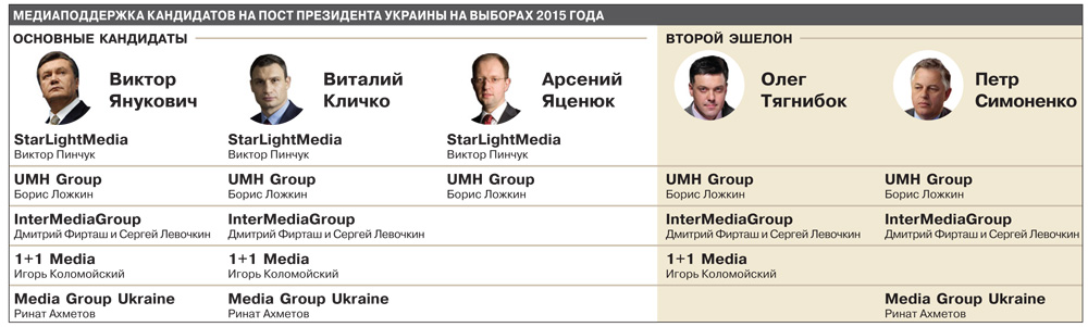 Похоже, что при нынешних политических раскладах из всех кандидатов в президенты только Виктор Янукович может с легкостью рассчитывать на сотрудничество с основными медиа-холдингами. Пять ведущих медиа-компаний страны - StarlightMedia Виктора Пинчука, UMH Group Бориса Ложкина, InterMediaGroup Дмитрия Фирташа и Сергея Левочкина, 1+1 Media Игоря Коломойского, Media Group Ukraine Рината Ахметова - контролируют подавляющее большинство украинского медиа-рынка. И, вне всяких сомнений, не станут вставлять палки в колеса нынешнему президенту.