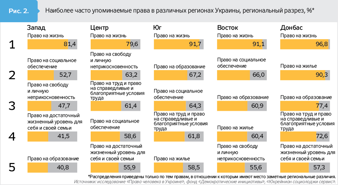 Два года приоритетными для украинцев остаются социально-экономические права: право на жизнь (его отметили 85% опрошенных), а также право на социальное обеспечение (59%), справедливый суд (58%), работу (56%), жилье (55%), образование (55%), свободу и неприкосновенность (55%).
