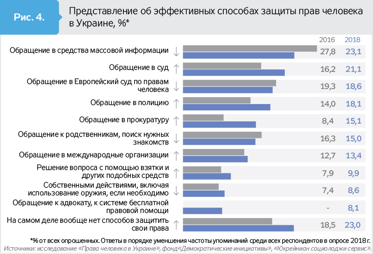 Грустно, но из всех доступных механизмов защиты своих прав треть населения выбирает… неправовые способы, включающие и преступные методы. Это свидетельствует о серьезном недоверии населения к власти и механизмам защиты прав человека.