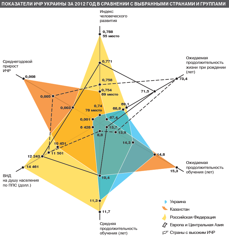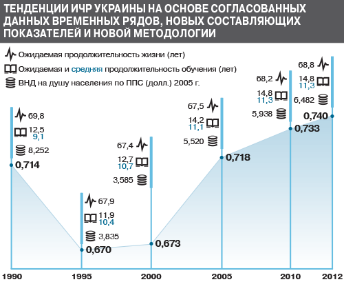 Еще одним подтверждением тому, что 22 года мы топчемся на одном месте, является крайне низкая динамика Украины в индексе человеческого развития. По продолжительности жизни и ВНП в расчете на душу населения мы вообще шли назад, и сегодня наши показатели хуже, чем в среднем по земному шару.